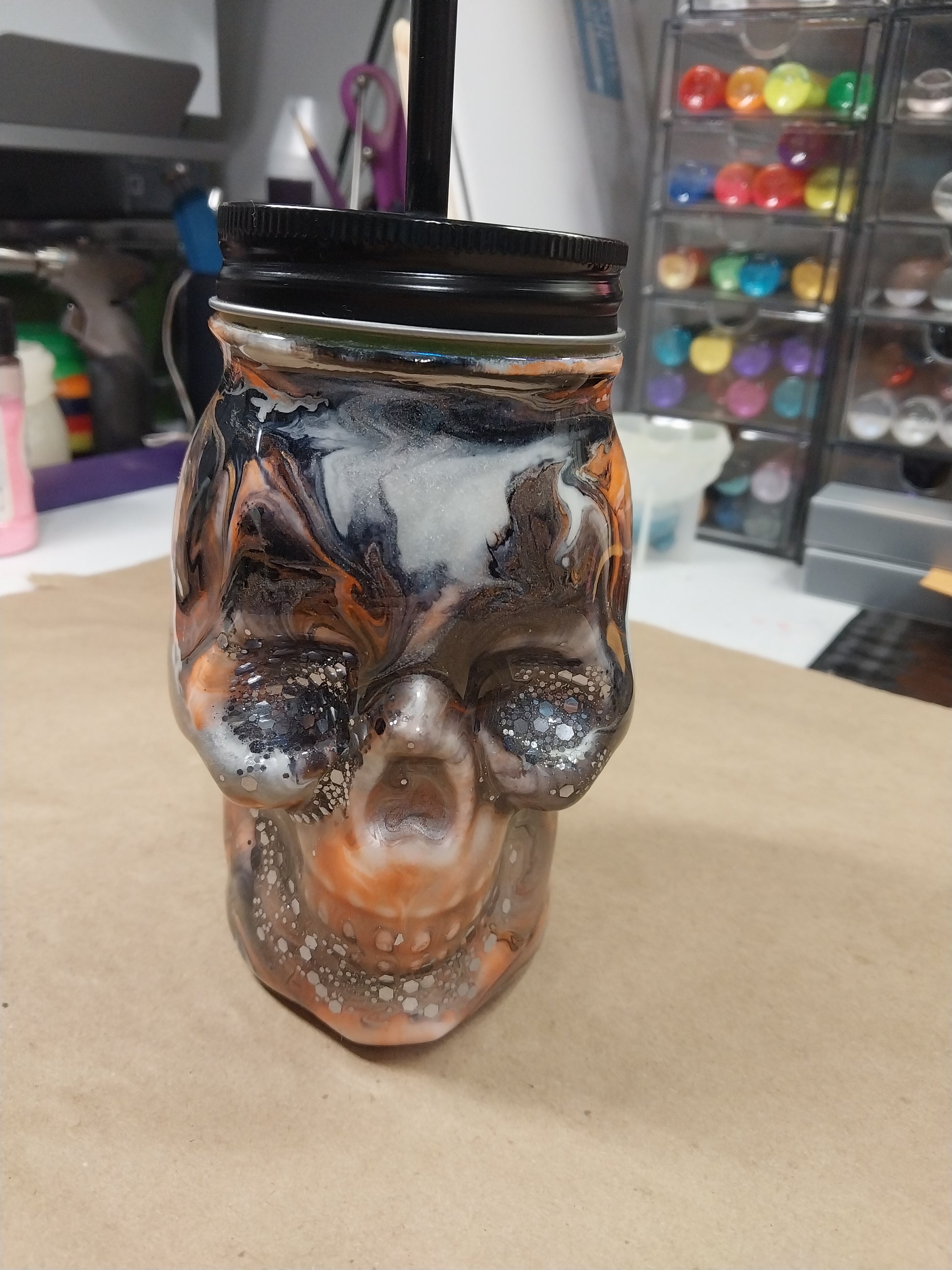 Custom Glass Skull Orange and Black glows in the dark